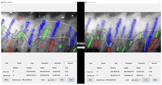 The result of the analysis of capillaroscopy images after PORH test (“,” the comma used in numbers corresponds to the decimal separator; description in the text).