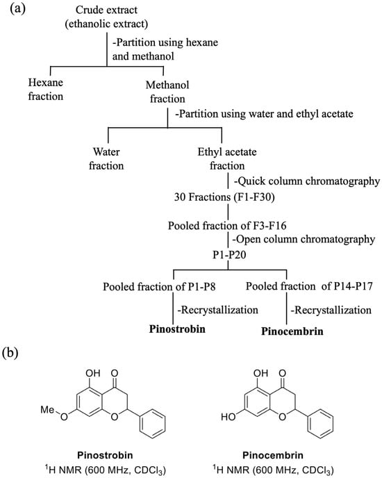 (a) Scheme of pinostrobin and pinocembrin isolation; (b) molecular structure of pinostrobin and pinocembrin.