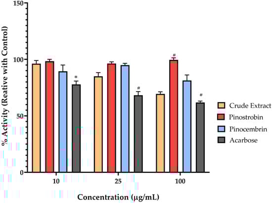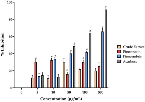 The alpha-amylase inhibitory activity of pinostrobin, pinocembrin, and the crude extract concentrations of 5, 10, 50, 100, and 500 µg/mL. Acarbose at the same concentration was used as a positive control. Bars marked with different symbols are significantly different compared to the crude extract (* p < 0.05, # p < 0.001).