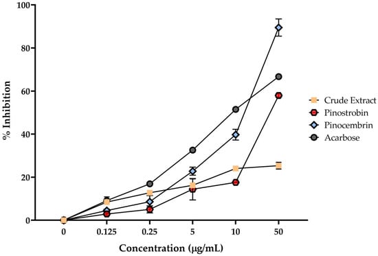 Pinostrobin, pinocembrin, and the crude extract of B. rotunda were evaluated for their α-amylase inhibitory activity, which may suggest potential antidiabetic effects. The percentage inhibition for each compound is presented in Figure 3, alongside the commercially available α-amylase and α-glucosidase inhibitor, acarbose, for comparison. Most compounds exhibited a concentration-dependent inhibitory effect, except for the crude extract and pinostrobin, which showed minimal activity. Pinocembrin demonstrated notable inhibition, reaching approximately 65% at a concentration of 500 µg/mL, while acarbose inhibited 93% of enzyme activity at the same concentration. Although pinostrobin and the crude extract displayed weak inhibition, pinocembrin exhibited significantly higher activity than the other test compounds, albeit still lower than that of acarbose.