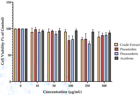 Cytotoxicity of pinostrobin, pinocembrin, and crude extract in Caco-2 cells. The cell viability was resolved using the MTT assay. After adhering the cells to the plate, the cells were treated with 10, 50, 100, 250, and 500 μg/mL of the compounds, and incubated for 24 h. The data are presented as mean ± SEM of the three experiments.