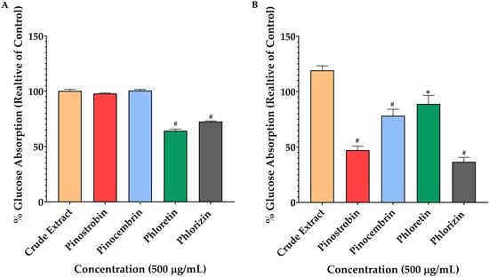 Effects of pinostrobin, pinocembrin, and crude extract on glucose transport across Caco-2 cell monolayers. Caco-2 cells were treated with 500 μg/mL of each compound, along with the SGLT1 inhibitor (phlorizin) and the GLUT inhibitor (phloretin), for 4 h at 37 °C. Glucose transport was assessed under two conditions: high-glucose medium, representing GLUT-mediated transport (A), and glucose-free medium, representing SGLT1-mediated transport (B). Bars labeled with different symbols indicate statistically significant differences to untreated cells (* p < 0.05, # p < 0.001).