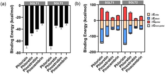 Molecular dynamics simulations were performed to gain insights into the stability and dynamic behavior of the protein-ligand complexes. Three distinct binding poses were selected for independent MD simulations to enhance conformational sampling. According to the RMSD of Cα of protein structure (Figure S1), the simulations showed that all complexes reached equilibrium during the simulation timescale. The complexes with the lowest binding energies were selected for visualization and further analysis (Figure S2). Relative binding free energies were calculated using the MM-GBSA method based on the MD trajectories (Table 4). The results confirmed that phlorizin consistently demonstrated the strongest binding affinity, particularly toward SGLT1 and SGLT2, aligning with its known role as a selective inhibitor for these transporters []. Among the other compounds, pinostrobin exhibited greater binding affinity than pinocembrin across all targets (Table 1 and Figure 8a).