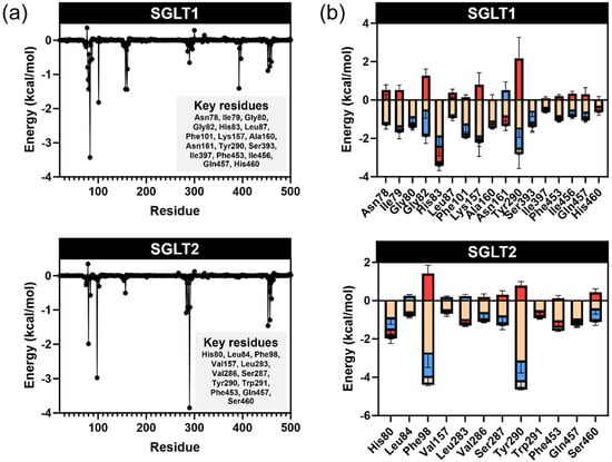 The MM-GBSA calculation results between pinostrobin and SGLTs: (a) per-residue energy decomposition analysis of MM-GBSA calculations. The black line indicates the total binding energy contribution of each residue.; (b) energy components of each key residue. The energy components are represented by the following colors: van der Waals (beige), electrostatic (blue), polar solvation (red), and non-polar solvation (grey).