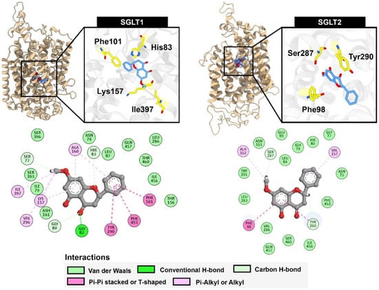 Dimensional binding poses and 2-dimensional protein-ligand interactions of pinostrobin within the substrate binding site of SGLT1 and SGLT2 extracted from the last frame of the molecular dynamics simulation trajectory.