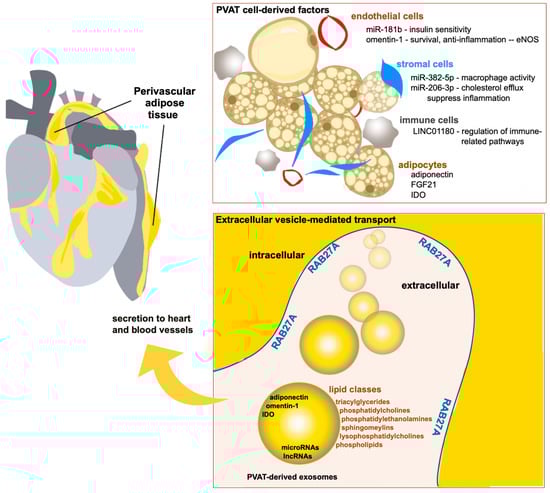 Model of PVAT-derived extracellular vesicle cardioprotective factors. PVAT is contiguous with the vascular adventitia, providing an anatomically linked mechanism for paracrine regulation of vascular smooth muscle cells of blood vessels and the heart. Multiple cell types contribute to the secretome of PVAT. For those molecules that are associated with extracellular vesicles, RAB27a is a critical regulator of multivesicular body fusion with the cellular plasma membrane, allowing for vesicular release. Several lipid classes implicated in cardioprotection have been reported to be associated with extracellular vesicles, as have adiponectin, omentin-1, and IDO.