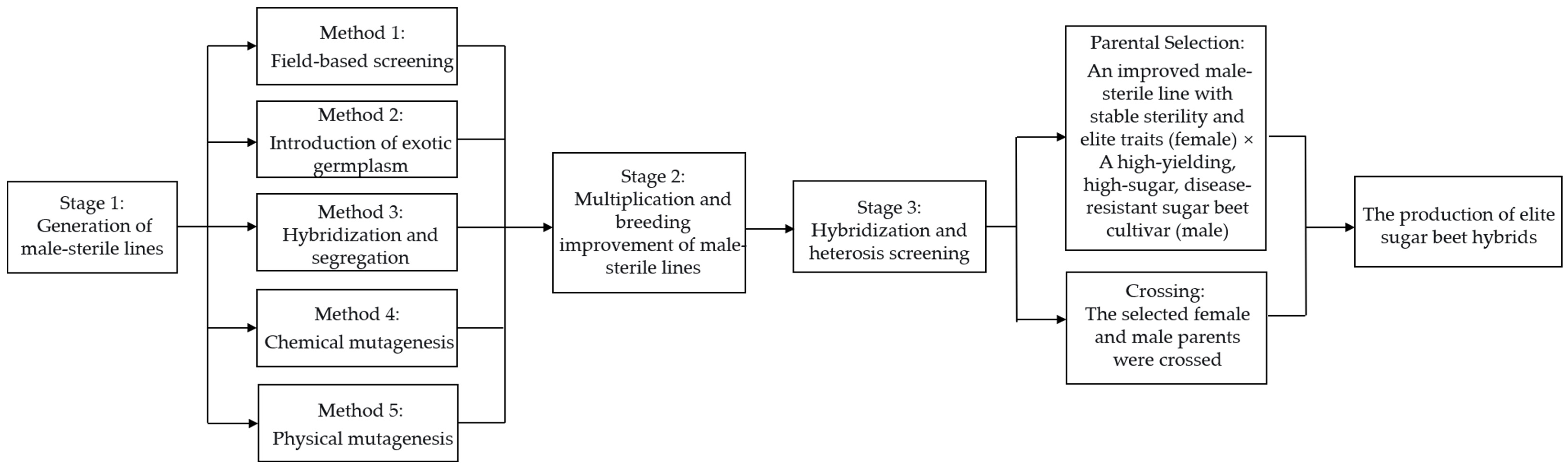 - Karakotov, S.D.; Apasov, I.V.; Nalbandyan, A.A.; Vasilchenko, E.N.; Fedulova, T.P. Modern issues of sugar beet (Beta vulgaris L.) hybrid breeding. Br. J. Pharmacol. 2021, 25, 394. [Google Scholar] [CrossRef]