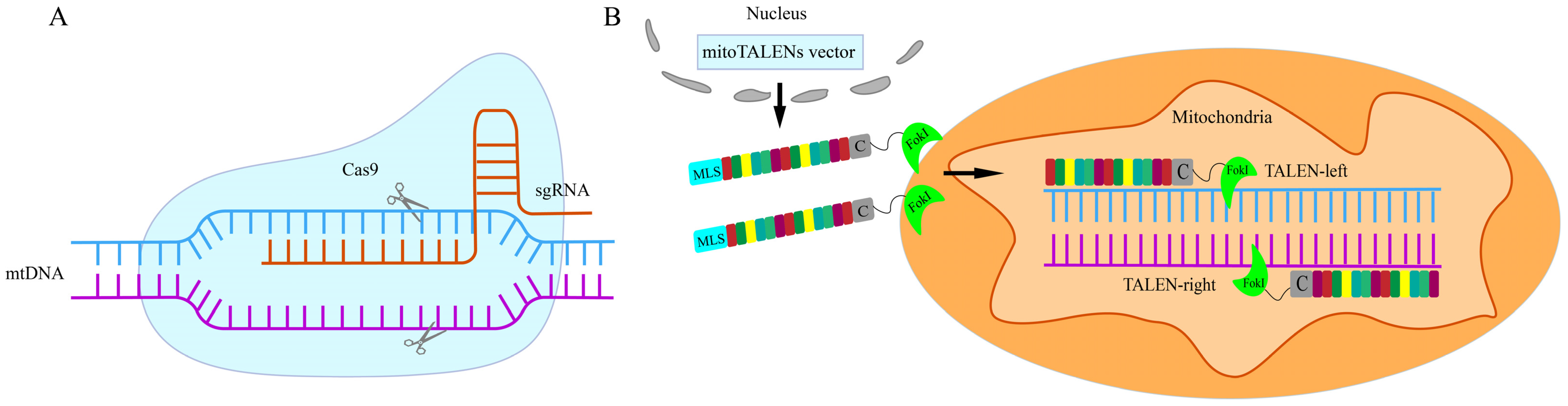 - Jo, A.; Ham, S.; Lee, G.H.; Lee, Y.I.; Kim, S.; Lee, Y.S.; Lee, Y. Efficient mitochondrial genome editing by CRISPR/Cas9. Biomed. Res. Int. 2015, 2015, 305716. [Google Scholar] [CrossRef]