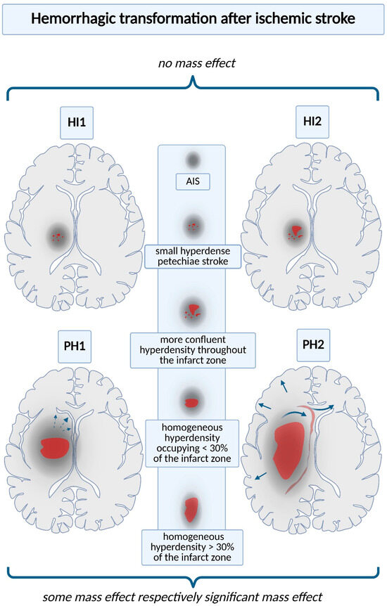 HT includes a broad spectrum of severity, each form being associated with subsequent complications ranging from small petechial hemorrhagic infarcts (HIs) to PH (Figure 1) [10]. On computed tomography, HI presents as an irregular hyperdense area within a portion of the ischemic lesion. PH appears as a more homogeneous, hyperdense hematoma with associated mass effect. Each HT category comprises two subtypes: HI is classified as HI1 and HI2, while PH is divided into PH1 and PH2. HI1 manifests as small, speckled hyperdense spots (petechial hemorrhage); HI2 denotes a more extensive and confluent hyperdensity extending through the infarcted tissue. HI1 and HI2 have no mass effect. PH1 presents as a homogeneous hyperdense hematoma involving < 30% of the infarcted territory, accompanied by mild mass effect. PH2 presents as a homogeneous hyperdense hematoma involving > 30% of the infarcted territory, with pronounced mass effect [29,30,31]. sICH and asymptomatic ICH after AIS have been differentiated, but the prognostic significance of asymptomatic ICH remains largely unknown [10].