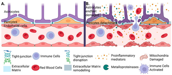 Structural and functional alterations of the blood–brain barrier (BBB) in cerebral ischemia. (A) Under physiological conditions, the BBB is maintained by the coordinated interaction between cerebral endothelial cells, pericytes, and astrocytic endfeet, supported by intact tight junctions and a stable extracellular matrix. (B) Cerebral ischemia or hemorrhagic transformation following thrombolysis may disrupt this balance. The release of matrix metalloproteinases (MMPs) affects not only the pericytes, causing them to detach, but also produces astrocytic endfeet damage, tight junction degradation, and extracellular matrix remodeling. This is followed by the infiltration with activated immune cells, pro-inflammatory mediators, and red blood cells, which promote extravasation. Mitochondrial damage further contributes to cellular dysfunction and the progression of injury.