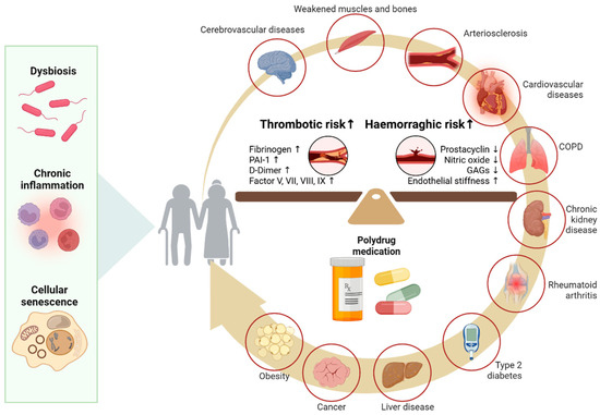 Age and blood-barrier dysfunction. As the body ages, molecular and cellular changes such as gut dysbiosis, chronic inflammation, and cellular senescence contribute to endothelial dysfunction and imbalances in the coagulation and fibrinolytic systems. These mechanisms are further aggravated by common comorbidities in the elderly (e.g., cardiovascular diseases, kidney disease, diabetes) and polypharmacy. PAI-1 (Plasminogen Activator Inhibitor-1) GAGs (Glycosaminoglycans).