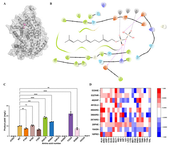 Further analysis of residues within a 5 Å radius of FPP allowed mapping of the local microenvironment of the active site (Figure 1B). A cluster of residues potentially critical for substrate binding and catalysis was identified. To quantitatively assess their functional contributions, alanine-scanning mutagenesis was conducted, systematically evaluating impacts on substrate affinity and product formation. This approach provides direct insight into the importance of catalytic residues and structural redundancy within the active site [6].