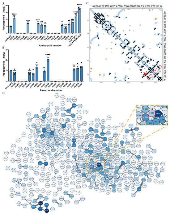 Functional role of key PcPTS residues. (A) Patchoulene production in wild-type (WT), *: Significant difference (e.g., p < 0.05); **: Significant difference (e.g., p < 0.01); ***: Etremely significant difference (e.g., p < 0.001); ****: Highly significant difference (e.g., p < 0.0001); T532 saturation mutagenesis, and mutant strains M1 (T532Y) and M2 (F456M/T532Y); (B) Patchoulene production in wild-type (WT) and F456 saturation mutagenesiss; *: Significant difference (e.g., p < 0.05); ****: Highly significant difference (e.g., p < 0.0001); ns: Not significant; (C) spatial contact map of the PHE456-THR532 residue pair; Red box: Delineates the region containing mutation sites; Red arrow: Directs attention to critical target regions requiring focused attention; (D) cooperative interaction network analysis of the PHE456-THR532 residue pair.