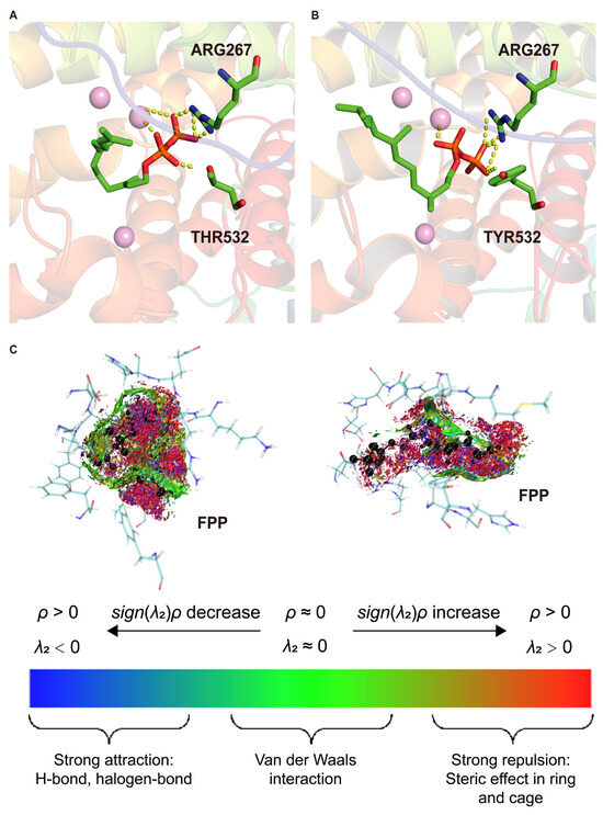To further investigate the underlying noncovalent interaction mechanisms, average noncovalent interaction (aNCI) analysis was performed on MD trajectories (Figure 3C). This method visualizes weak interactions such as van der Waals forces, hydrogen bonds, and steric repulsion based on electron density (ρ) and the second eigenvalue (λ2) of the Hessian matrix: λ2 < 0 and ρ > 0 indicate attractive interactions, whereas λ2 > 0 and ρ > 0 indicate repulsion. In the WT–FPP complex, extensive red regions around the pyrophosphate and isoprenoid chain indicate strong steric repulsion and suboptimal substrate accommodation. Sparse and dispersed green van der Waals clouds suggest weak and poorly organized stabilizing interactions, consistent with elevated RMSD values, indicating that the WT active site cannot maintain a catalytically favorable binding conformation.