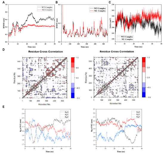 Molecular dynamics trajectory analyses. (A) RMSD analysis; (B) RMSF analysis; (C) SASA analysis; (D) differential contact correlation matrix (DCCM) of the wild type (WT) and the M2 (F456M/T532Y) mutant; (E) radius of gyration (Rg) analysis of the wild type (WT) and the M2 (F456M/T532Y) mutant.