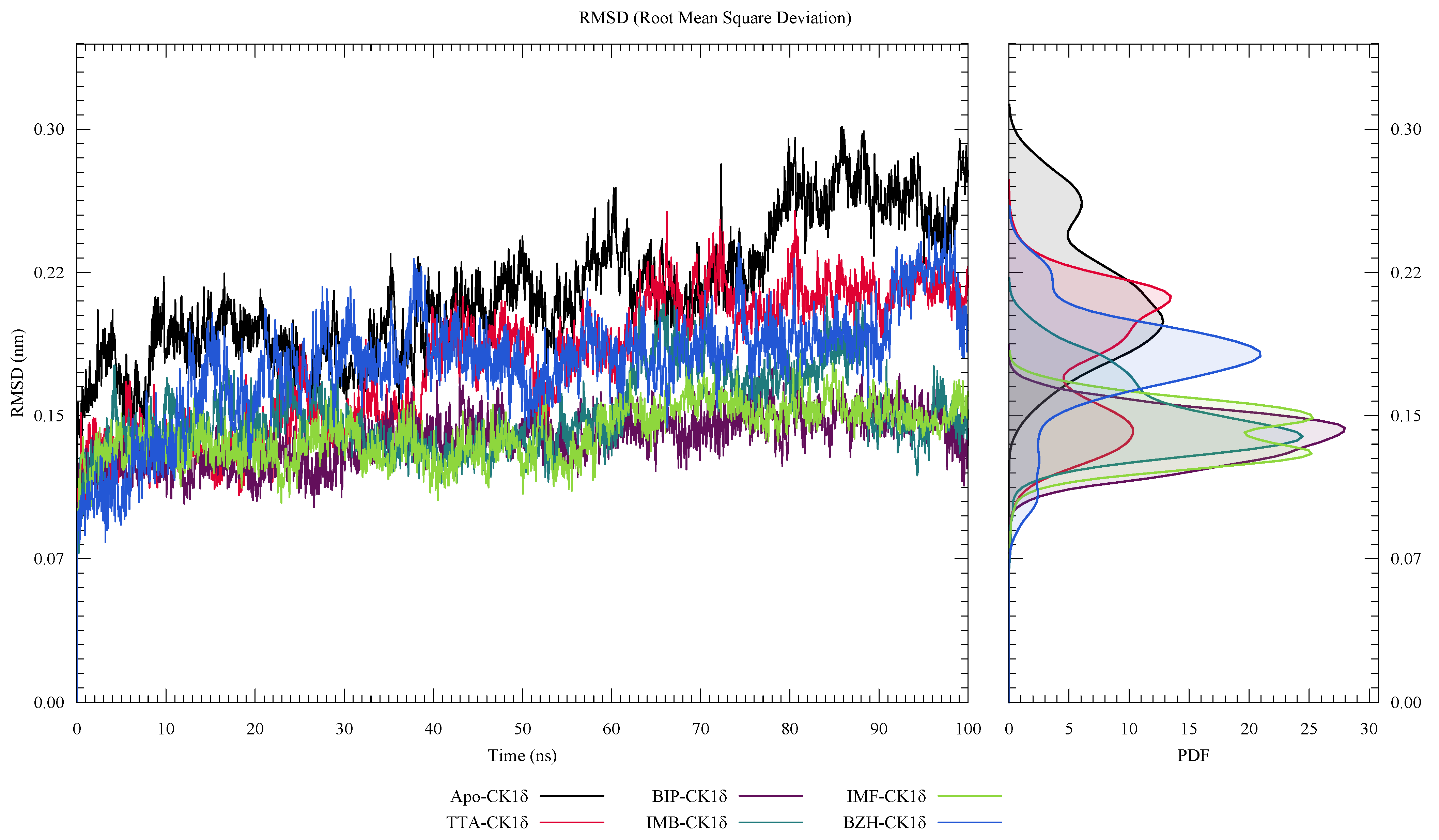 - Long, A.; Zhao, H.; Huang, X. Structural Basis for the Interaction between Casein Kinase 1 Delta and a Potent and Selective Inhibitor. J. Med. Chem. 2012, 55, 956–960. [Google Scholar] [CrossRef]