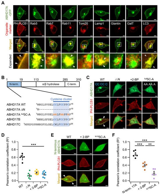 ABHD17 family proteins are broadly expressed in vertebrates and localize to the PM and endosomal compartments. We examined their subcellular localization in more detail in HEK293T cells using various endomembrane markers. Consistent with prior reports, ABHD17 proteins localized to the PM, early endosomes (EEs), and recycling endosomes (REs) [,,], and also to lysosomes and autophagosomes (Figure 1A and Figure S1A,B). To test whether palmitoylation determines this distribution, we first genetically engineered two ABHD17A variants that abolish N-terminal palmitoylation: a deletion lacking the N-terminal region (residues 2–18; ∆N) and a mutant with alanine at all five N-terminal cysteines (5C-A) (Figure 1B). Additionally, we treated cells expressing WT ABHD17A with the commonly used palmitoylation inhibitor 2-bromopalmitate (2-BP), verified using the PM marker pleckstrin homology domain of phospholipase C-δ1 (PH-PLCδ1). As shown in Figure 1C,D, the ABHD17A ∆N and 5C-A variants failed to associate with the PM, and treatment with 2-BP decreased ABHD17A palmitoylation and reduced PM association. Similar results were obtained for ABHD17B and ABHD17C (Figure S2). Consistent phenotypes were observed in HeLa cells, where disruption of N-terminal palmitoylation similarly abolished PM association, indicating that this requirement generalizes across cell types (Figure S3). These observations indicate that N-terminal palmitoylation is required for PM localization of ABHD17A, in line with previous work [,]. Interestingly, when expressed in isolation, the N-terminus of ABHD17A was sufficient to target the PM but did not localize to early or recycling endosomes (Figure 1E,F and Figure S4). Compared to full-length ABHD17A, the N-terminus displayed a partial cytosolic signal. Taken together, these data show that N-terminal palmitoylation is essential for localization to the PM, whereas sequences outside the N-terminus are required for trafficking to early and recycling endosomes.