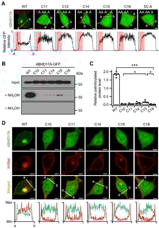 We next examined whether individual cysteines within the N-terminal palmitoylation cluster differentially contribute to stable membrane association and palmitoylation. To this end, we generated single-cysteine variants that retain only one cysteine in the cluster (C10, C11, C14, C15, C18) and expressed them in HEK293T cells to assess intracellular distribution. Confocal imaging with normalized line scan analysis showed that all five single-cysteine variants, similar to the 5C-A mutant, failed to localize to the PM and to any endomembrane compartments (Figure 2A). Furthermore, palmitoylation was assessed by Acyl-RAC, an enrichment assay that selectively captures S-acylated cysteines after hydroxylamine treatment, thereby reporting palmitoylation levels []. Compared with ABHD17A WT, palmitoylation was not effectively detected in any of the single-cysteine variants (Figure 2B,C). These results indicate that a single N-terminal cysteine is insufficient for palmitoylation and for stable membrane association of ABHD17A, which harbors a multi-cysteine palmitoylation cluster. To test whether any single-cysteine variant retains depalmitoylase activity, we co-expressed mCherry-H-Ras, a well-established ABHD17A substrate. H-Ras contains two palmitoylation sites at its C-terminus (C181 and C184), and mCherry was fused at the N-terminus to avoid interference. In cells expressing ABHD17A WT, mCherry-H-Ras was depalmitoylated and released from the PM into the cytosol. In contrast, each single-cysteine variant failed to induce H-Ras depalmitoylation, indicating a loss of depalmitoylation activity, as shown in single-cell images and corroborated by multicell fields (Figure 2D and Figure S5). Collectively, these results demonstrate that ABHD17A requires more than one N-terminal cysteine (at least two) for S-palmitoylation, membrane association, and depalmitoylase activity.