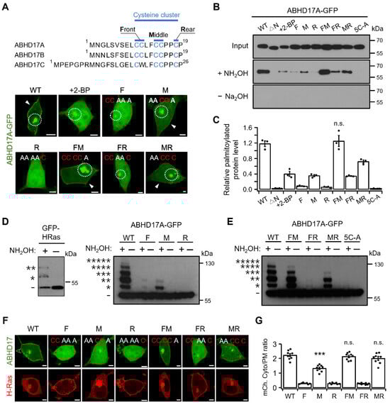 ABHD17 family constructs were subcloned into the pEGFP-N1 vector (Clontech, Mountain View, CA, USA). H-Ras was PCR-amplified and inserted into the mCherry-C1 vector (Clontech, Mountain View, CA, USA). The N-terminal deletion (ΔN, residues 1–19) and all point-mutation variants were generated using inverse PCR. Single-cysteine variants were constructed as follows: C10-only (C11A/C14A/C15A/C18A), C11-only (C10A/C14A/C15A/C18A), C14-only (C10A/C11A/C15A/C18A), C15-only (C10A/C11A/C14A/C18A), and C18-only (C10A/C11A/C14A/C15A). “Code” mutants that restrict palmitoylatable positions within the N-terminal cluster included: F retains C10/C11 (C14A/C15A/C18A), M retains C14/C15 (C10A/C11A/C18A), R retains C18 (C10A/C11A/C14A/C15A), FM = C18A, FR = C14A/C15A, and MR = C10A/C11A. All constructs were verified by DNA sequencing (Macrogen, Republic of Korea).