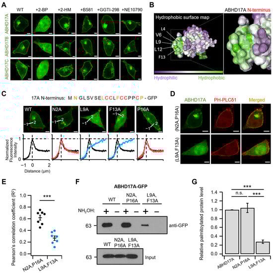 We next used AlphaFold2 to model the fold of full-length ABHD17A and Protein-Sol to predict its solubility. Guided by the solved structure of APT1, a representative alpha/beta hydrolase, the ABHD17A model was interpreted using APT1 as a structural benchmark to contextualize the overall fold []. The N-terminus of ABHD17A exhibited pronounced hydrophobic character (Figure 4B), whereas the predicted electrostatics were approximately neutral according to Protein-Sol (Figure S10B). These biophysical features prompted us to test whether hydrophobic residues adjacent to the N-terminal palmitoylation cluster facilitate initial endomembrane engagement and PM association. Thus, we performed alanine-scanning mutagenesis of the N-terminus-GFP construct. Confocal imaging with line scanning analysis revealed that single substitutions at L4, V6, L9 and F13 reduced PM association. The effects were modest for L4A and V6A, which retained partial PM signal, while L9A and F13A nearly abolished PM localization (Figure 4C and Figure S11). Despite the powerful application of alanine scanning, we created double mutant forms (L9A/F13A and N2A/P16A as a negative control) to account for potential cooperative interactions between residues. Interestingly, the L9A/F13A double mutant not only lacked colocalization with the PM marker PH-PLCδ1, but it also exhibited almost no ability to reach the endomembrane. In contrast, the randomly mutated negative control double mutant N2A/P16A was well expressed in both the PM and endomembrane (Figure 4D,E). Finally, Acyl-RAC confirmed a marked reduction in palmitoylation for the L9A/F13A double mutant relative to WT ABHD17A (Figure 4F,G). Taken together, these data indicate that hydrophobic residues in the N-terminus, particularly L9 and F13, promote the pre-palmitoylation endomembrane engagement that enables subsequent palmitoylation and proper PM targeting.