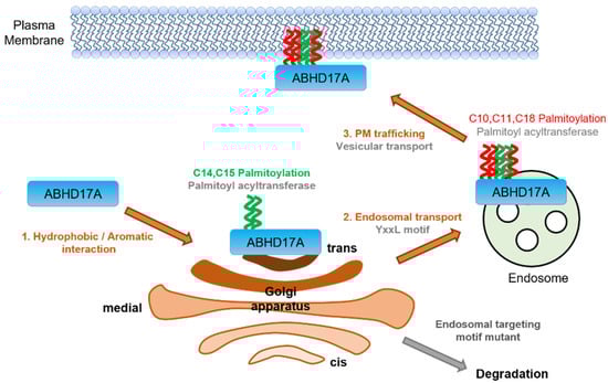This study defines a multi-step itinerary by which the depalmitoylase ABHD17A achieves PM residency and catalytic activity. We demonstrate that site-specific palmitoylation within a conserved N-terminal cysteine cluster functions as a palmitoylation “code” that dictates intracellular distribution and function. In this code, modification of the middle region (C14, C15) serves as the principal determinant for PM targeting and activity toward membrane-bound substrates such as H-Ras, whereas the front (C10, C11) and rear (C18) positions modulate endosomal routing, thereby influencing delivery to the PM (Figure 6). These findings support the broader concept that multisite palmitoylation can encode distinct trafficking outcomes for a single protein, as established for SNAP25 and the PI4KIIIα complex [,]. Additionally, they align with emerging perspectives that Golgi electrostatics, including PtdIns4P-dependent negative charge, play a crucial role in recruiting and positioning substrates, and that thioesterases actively shape palmitoylation cycles by engaging membranes and extracting acyl chains [,].