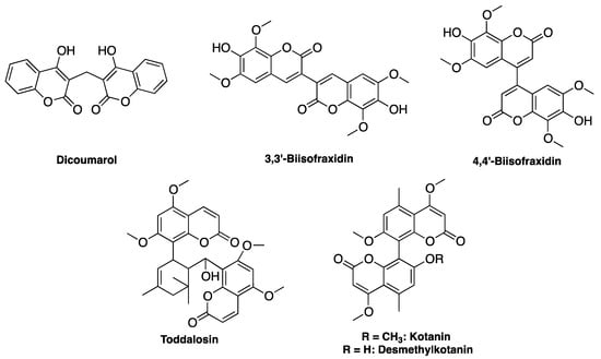 Among the numerous MAOIs developed, coumarin-based derivatives are well-documented MAO inhibitors with good MAO-A/B selectivity ratios, depending upon the nature and pattern of their substitution, and great potential as multitarget agents for neurodegenerative diseases []. Coumarins have a high electron count and exhibit good charge transport capabilities []. The coumarin moiety taken as a scaffold is synthetically versatile and widely used in the preparation of biologically active molecules. Indeed, coumarin derivatives have found a wide variety of applications for their anticoagulant, anti-inflammatory, anticancer, antidiabetic, anti-neurodegenerative, antioxidant, antidepressive, and antimicrobial effects []. Coumarin dimers (i.e., biscoumarins), mostly of natural origin, also form a bioactive scaffold. Very often these are symmetrical homodimers, like, for example, dicoumarol and its substituted derivatives [,], 3,3′-biisofraxidin (from Sarcandrae Herba) [] and 4,4′-biisofraxidin (from Impatiens balsamina) [], 8,8′-biscoumarins like toddalosin (from Toddalia asiatica) [], and the mycotoxins kotanin and desmethylkotanin (from Aspergillus glaucus) [] (Figure 1). Biscoumarins also attracted significant interest due to their wide range of biological activities such as antimicrobial [], anti-inflammatory [], anticancer [], anti-obesity [], antiviral [,], antidiabetic [], MAO inhibitory [], and anticholinesterase [,,] activities.