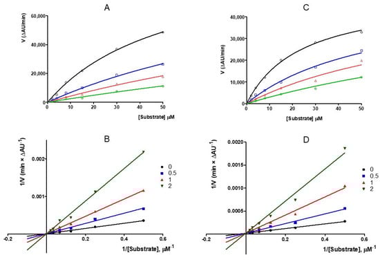 Michaelis–Menten (A,C) and Lineweaver–Burk (B,D) plots of inhibition kinetics of MAO-A for compounds 2b (A,B) and 5b (C,D).
