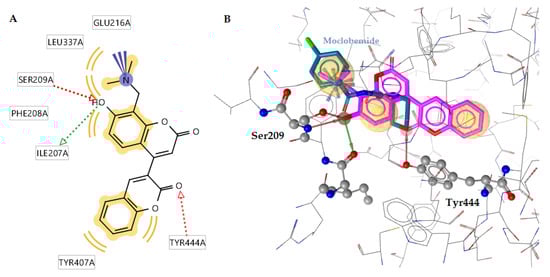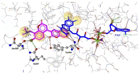By orienting the coumarin moiety into a flexible cavity primarily lined by Phe208 and Val210 through hydrophobic contacts, the biscoumarin 2a may bind MAO-A strongly. The coumarin benzene ring is well accommodated into the catalytic cleft facing the FAD cofactor (Figure 4) by the formation of stable hydrogen bonding through Tyr444 (1.59 Å). Two residues, namely Ser209 and Ile207, should contribute to stabilizing the complex interacting with the phenolic OH at C7 of the inhibitor as the H-bond donor (2.87 Å) and acceptor (3.05 Å), respectively. Moreover, the protonated tertiary amine of 2a may attain a salt bridge strengthened by H-bonds with Glu216. In addition, several hydrophobic residues, such as Phe208, Val303, Ile335, Phe352, Tyr444, and Met445, should form extra hydrophobic interactions with the inhibitor into the active site (Figure 3A). The drug moclobemide, taken as a reference MAOAI, exhibited a similar binding mode (Figure 3B). Figure 3 highlights an almost parallel aromatic stacking between flavin and distal coumarin moiety.