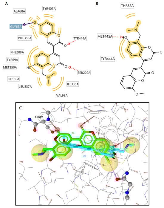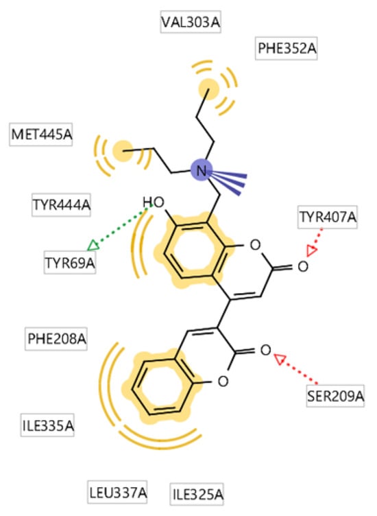 With the increasing size of the alkyls on the tertiary amino groups beyond the ethyl groups, like in 4a (Figure 5), it can be reasonably hypothesized that the potency decrease could be due to a change in the binding mode with a decrease in the ligand efficiency. Indeed, the interactions of the n-propyl groups of the tertiary amine in 4a with the hydrophobic residues (Tyr444, Met445, Val 303, Phe352) most likely do not compensate the loss of electrostatic interactions and H-bonding achieved by the NMe2 group with Glu216. In addition to the hydrophobic and aromatic interactions around the two coumarin moieties, two key interactions characterize the different (less efficient) binding mode of 4a compared to that of the more active 2a, i.e., Ser209 as the H-bond donor to the carbonyl O of the second coumarin nucleus (instead of the phenolic OH) and Tyr407 as the H-bond donor to the O of the first coumarin nucleus.