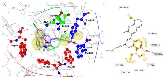 The examined biscoumarin derivatives were also docked against AChE using the crystal structure of the Torpedo californica AChE in complex with donepezil (pdb 1EVE). To validate the docking protocol, donepezil was re-docked using AutoDock, and the resulting RMSD value between the ligand and the re-docked pose was 1.95 Å, which demonstrated the reliability of the docking protocol. Information about all the docking simulations is reported in the Supplementary Materials (Table S2), whereas Table 3 summarizes the results (i.e., free binding energy and the contacting residues) of some selected ligands, including the most potent AChE inhibitor 3c identified in the series (Figure 7).
