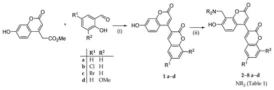 Synthesis scheme of 8-[(dialkylamino)methyl]-4-(2-oxo-2H-chromen-3-yl)-7-hydroxy-2H-chromen-2-one derivatives. Reagents and conditions: (i) DBU, abs. 1,4-dioxane (DMF for 1d), 100–105 °C, 4–10 h; (ii) suitable aminal, 1,4-dioxane, reflux, 3–5 h.