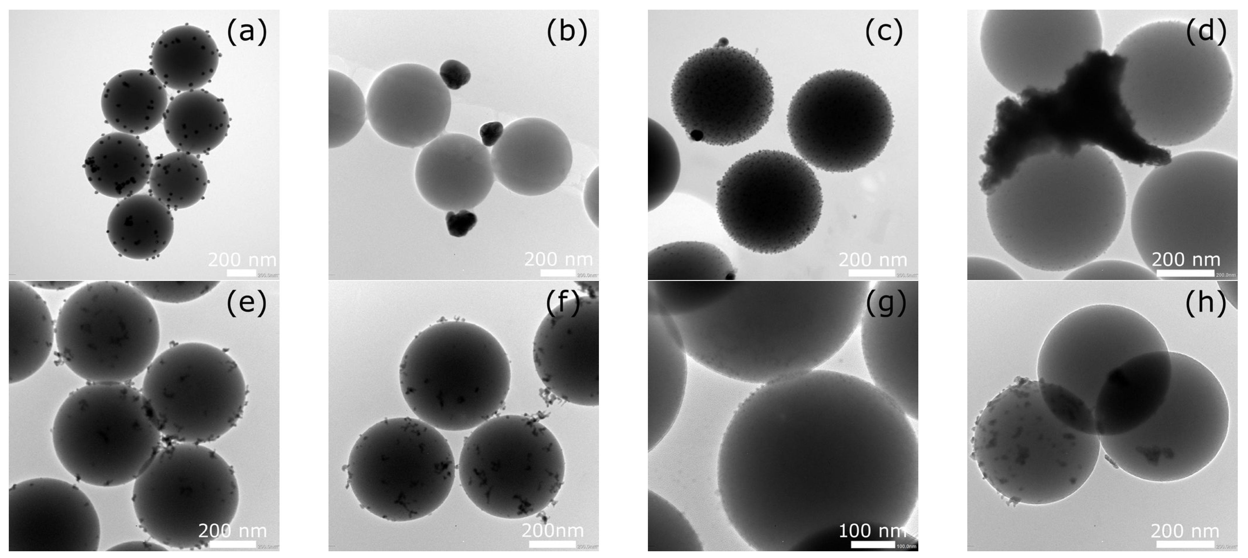 2.1. Morphological Characterization of Silica Spheres Coated with Silver and Bismuth Nanoparticles