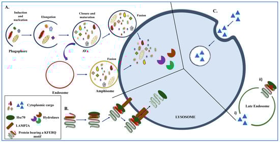 The ALP, consisting as mentioned above of macroautophagy (Figure 2A), CMA (Figure 2B), and microautophagy (Figure 2C), is responsible for the delivery of cellular components, damaged organelles, and protein aggregates to the acidic environment of the lysosomes for subsequent degradation. Macroautophagy is mediated by the formation of double-membrane vesicles, called autophagosomes (autophagic vacuoles, AVs), which are then fused with the lysosomes for bulk degradation []. The first step of mammalian macroautophagy includes the formation of the phagophore (induction and nucleation step), which then engulfs the cytoplasmic material, followed by the elongation of the phagophore membrane and the fusion of its edges to finally form the autophagosome (elongation, closure, and maturation step). Then, the autophagosome is delivered to the lysosome to form the autolysosome (fusion step), where the digestive enzymes (hydrolases) are responsible for the degradation of the luminal material (Figure 2A). The resulting materials are then released and recycled in the cytosol. Alternatively, the autophagosome may fuse with an endosome to form an amphisome, before fusing with the lysosome [].