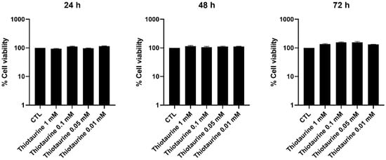 Cell viability was assessed by the MTS colorimetric method, and HPCs were treated with four concentrations, 1 mM, 0.1 mM, 0.05 mM, and 0.01 mM of Thiotaurine, for 24, 48, and 72 h. Cell viability of treated samples was normalized to the untreated cells (CTL).