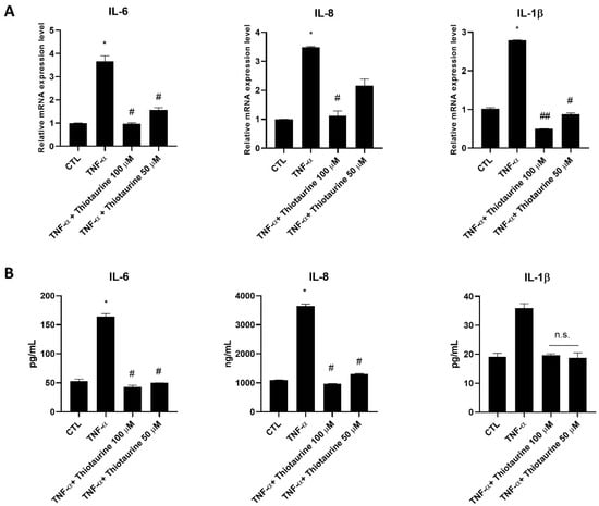 Effects of Thiotaurine on interleukin expression levels and secretion under TNF-α stimulus. (A) Cells were left untreated (CTL), or stimulated with 10 ng/mL TNF-α for 30 min, or treated with 100 μM and 50 μM concentrations of Thiotaurine for 1 h and then stimulated with 10 ng/mL TNF-α for 30 min. After treatments, mRNA was extracted and analyzed by RT-PCR. IL-6, IL-8, and IL-1β mRNA levels were reported as relative mRNA expression levels with respect to 18S mRNA (2−ΔΔCt method). (B) Cells were left untreated (CTL) or stimulated with 10 ng/mL TNF-α for 1 h or treated with 100 μM and 50 μM concentrations of Thiotaurine for 1 h and then stimulated with 10 ng/mL TNF-α for 1 h. After treatments, the supernatant media were collected and analyzed by ELISA. The results are reported as ng/mL or pg/mL, and all the results are expressed as mean ± standard deviation (SD) of data obtained by three independent experiments. * p < 0.05 TNF-α vs. CTL; # p < 0.05 Thiotaurine vs. TNF-α; and ## p < 0.01 Thiotaurine vs. TNF-α; not significant (n.s) Thiotaurine vs. TNF-α.