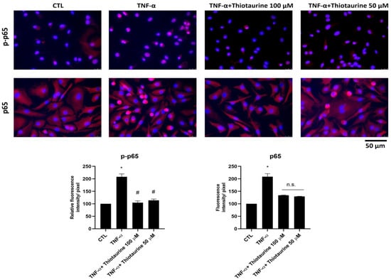 Effects of Thiotaurine on phosphorylation (p-p65) and expression of p65. Cells were treated with 100 μM and 50 μM Thiotaurine for 1 h and then stimulated with 10 ng/mL TNF-α for 10 min and then analyzed by immunofluorescence using anti-p-p65 and p65 primary antibodies and Alexa Fluor 594 (red) secondary antibody. Nuclei were stained with DAPI (original magnification 40×). The bar graph represents the pixel intensities in the region of interest, obtained by ImageJ. The p-p65 intensity has been normalized with respect to total p65. The results are expressed as mean ± SD of data obtained by three independent experiments. * p < 0.05 TNF-α vs. CTL; # p < 0.05 Thiotaurine vs. TNF-α. Not significant (n.s.) Thiotaurine vs. TNF-α.