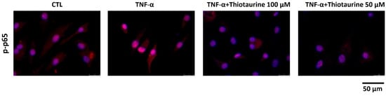Effects of Thiotaurine on p65 phosphorylation (p-p65). Cells were treated with 100 μM and 50 μM Thiotaurine for 1 h and then stimulated with 10 ng/mL TNF-α for 10 min and then analyzed by immunofluorescence using anti-p-p65 primary antibody and Alexa Fluor 594 (red) secondary antibody. Nuclei were stained with DAPI (original magnification 63×).