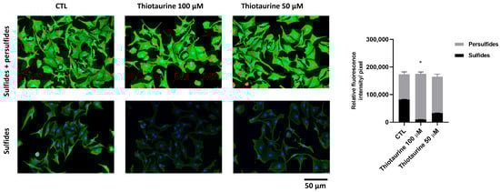 To visualize sulfide only, cells were incubated with DTT. The differences between the integrated fluorescence density values obtained in sulfide and persulfide wells and sulfide wells indicated the persulfide expression. The expression of sulfide and persulfide species was not influenced by the Thiotaurine treatment at either of the used concentrations. After the DTT treatment, the persulfide species were lost due to sulfur bond cleavage, and only sulfide species remained fluorescent. The Thiotaurine treatment caused a decrease in sulfide species, as can be seen in Figure 5 (bottom line); this means that the persulfide species were higher in Thiotaurine-treated cells compared to the CTL, and 100 μM was more effective than the 50 μM concentration (Figure 5).