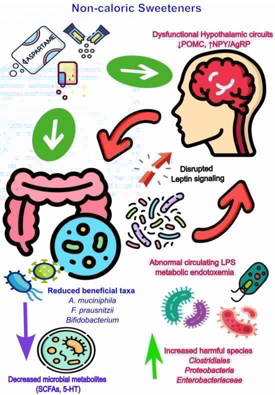 LPS-mediated systemic inflammation induced by NCSs may disrupt homeostatic regulation of appetite and promote increased energy intake. While a meta-analysis of 20 human randomized controlled trials found no significant changes in serum leptin levels following NCS consumption [], molecular docking studies indicate that aspartame and sucralose exhibit high binding affinity for the leptin receptor []. As emerging mechanisms, this may suggest potential for receptor internalization (i.e., desensitization) or competitive inhibition, further contributing to leptin resistance. Lactobacillus and Bifidobacterium species, including L. gasseri, L. johnsonii, B. longum, and B. lactis, are recognized for their roles in satiety regulation and energy homeostasis due to their capacity to stimulate GLP-1 release and enhance leptin and melanocortin precursor POMC signaling [,]. These psychobiotic strains have garnered attention for their ability to modulate GBA activity via synthesis and regulation of neuroactive compounds, notably serotonin (5-HT) [,]. Serotonin plays a central role in both mood and metabolic regulation, influencing appetite, energy balance, and even neurodegeneration [,]. Notably, L. acidophilus and B. longum upregulate serotonin transporter (SERT) expression in intestinal epithelial cells [], thereby increasing serotonergic signaling within the gut. The interplay between peripheral 5-HT production and brain 5-HT is demonstrated by the capacity of the GM to alter systemic tryptophan levels, a precursor of 5-HT, thus affecting its cerebral turnover []. For instance, supplementation with Bifidobacterium infantis has been shown to elevate plasma tryptophan concentrations [], facilitating its transport across the blood–brain barrier and subsequently enhancing central 5-HT synthesis []. However, NCSs such as sorbitol and sucralose have been linked to declines in beneficial taxa, including Bifidobacterium, Lactobacillus, and Bacteroides [,], suggesting that chronic exposure may diminish gut-derived serotonin and impair serotonergic regulation of appetite and energy balance [,]. Moreover, species of Lactobacillus and Bifidobacterium also support host metabolism via SCFA production and immune modulation, which are critical for regulating feeding and body weight. SCFAs stimulate the secretion of GLP-1 and PYY, and metabolites like acetate enhance POMC expression while suppressing AgRP, collectively promoting satiety [,]. Given that some NCSs (e.g., sucralose, saccharin, aspartame) reduce SCFA levels, particularly butyrate and propionate [,,], and that these are predominantly produced by F. prausnitzii and Bacteroides spp., NCS-induced dysbiosis may impair microbial metabolite production, blunting satiety hormone release such as GLP-1 and PYY, and disrupting enteroendocrine signaling and central homeostatic-regulating circuits such as POMC/AgRP signaling.