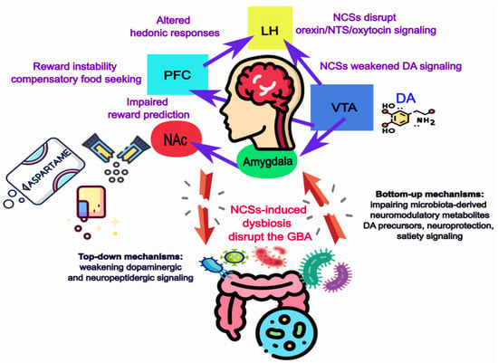 Within this context, the gut–brain axis (GBA) represents a complex, bidirectional communication network linking the central nervous system (CNS) with the enteric nervous system (ENS) of the gastrointestinal tract []. In particular, multiple signals from the gut microbiota (GM) reach the brain also through the autonomic nervous system and the vagus nerve, as well as via neuroendocrine and immune pathways through the hypothalamic–pituitary–adrenal axis, immune cells, and cytokines mediating inflammation and GBA signaling []. The vast and diverse community of microorganisms living in the human intestine takes the name of GM that significantly influences brain health through the production of neurotransmitters (e.g., GABA, serotonin precursors), short-chain fatty acids (SCFAs), and the immune-microbiota loop by which the microbial community modulates innate and adaptive immunity, and immune mediators (e.g., cytokines, pattern recognition receptors) influence microbial composition []. Microbial dysbiosis has been linked to impaired appetite regulation and disrupted energy homeostasis, with the GBA playing a key role in mediating these effects []. By altering the composition, diversity, and functionality of GM, NCSs can induce dysbiosis and further impair gut–brain communication, potentially contributing to metabolic dysregulation (e.g., glucose intolerance) [], disordered eating behaviors [], and altered food reward processing as showed in consumers of NCS-added beverages (i.e., diet soda drinkers) []. Despite some conflicting data, studies in both animal models and humans have shown that certain sweeteners (e.g., sucralose) can induce shifts in bacterial taxa associated with metabolic alterations [,], as well as for instance for aspartame consumption that was showed to increase fasting glucose levels and the abundance of Enterobacteriaceae and Clostridium leptum in obese rats []. There is therefore evidence that NCSs may alter neural circuits and neurochemical signaling involved in both satiety and reward processing, potentially exacerbating the consumption of ultra-processed, energy-dense foods [], through mechanisms involving the GBA, the hypothalamus, amygdala, and dopaminergic signaling pathways of the mesocorticolimbic circuit [,].