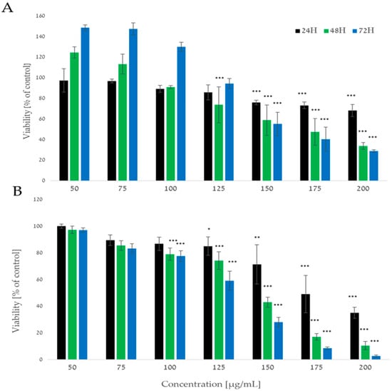 A. europaea extract reduces cell viability of human pancreatic cells. PL45 (A) and Mia PaCa-2 (B) cells were treated with increasing concentrations of A. europaea (50–200 µg/mL) for 24, 48, and 72 h and cell viability was determined using XTT assay. Data represent an average of three independent experiments; per experiment n = 3–5 repeats (mean ± SE) and are expressed as a percentage of the respective vehicle untreated control. Statistical significance was determined by one-way ANOVA test for post hoc to compare between concentrations and two-way ANOVA for time and concentration interactions. * p < 0.05, ** p < 0.01, and *** p < 0.001 indicate statistically significant differences compared with the untreated control.