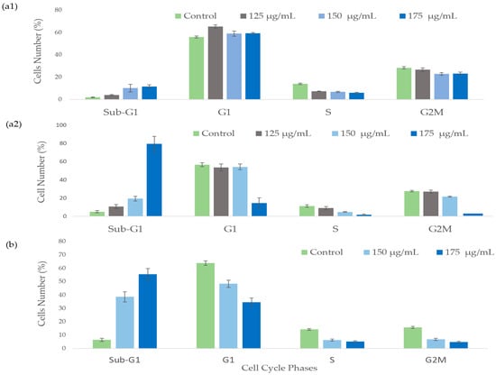 The effect of A. europaea extract on cell cycle distribution on PL-45 cell line (a1,a2) and on Mia PaCa-2 cell line (b). In total, 106 PL-45 cells were treated with 125–175 μg/mL of A. europaea extract for 48 (a1) and 72 h (a2). A total of 106 Mia PaCa-2 cells were treated with 150 and 175 μg/mL of A. europaea extract for 36 h (b). At the end of treatments, cells were harvested, fixed, and stained with PI. Quantitative analysis of DNA content in each phase was conducted by FACS. Data presented are average of three independent experiments (mean ± SE) and are expressed as percentages of the respective controls. Statistical significance was determined by two-way ANOVA for each cell line (p < 0.001).