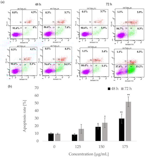 Measurement of apoptotic cells using Annexin V-FITC/PI double staining on PL45 (a,b) and Mia PaCa-2 (c,d) cells. In total, 106 PL-45 cells were treated with either 125, 150, or 175 µg/mL of extract of A. europaea for 48 and 72 h. A total of 106 Mia PaCa-2 cells were treated with either 150 or 175 µg/mL of the extract for 36 h and flow cytometric analysis of Annexin V-FITC/PI double staining was performed. In each plot (a,c), the lower left quadrant (Q3) represents viable cells, the upper left quadrant (Q1) indicates necrotic cells, the lower right quadrant (Q4) denotes early apoptotic cells, and the upper right quadrant (Q2) represents necrotic or late apoptosis cells. Data are presented as the mean ± SE of three independent experiments [mean (Q2 + Q4) ± SE] (b,d). Statistical significance was determined by a two-tailed Student’s t-test [treatment vs. control (untreated cells)] and is indicated as * p < 0.05, ** p < 0.01.