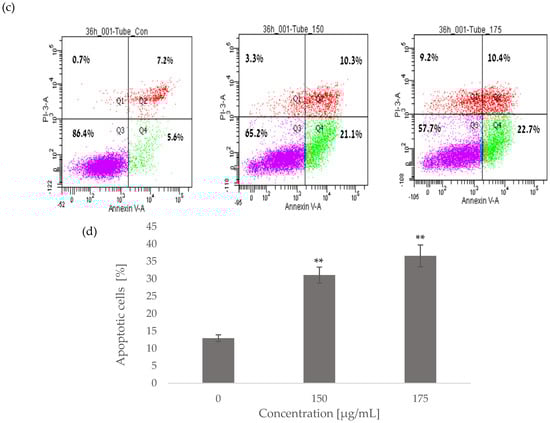 Annexin V-FITC and propidium iodide (PI) staining were used to quantify the proportion of cells undergoing apoptosis and necrosis and those remaining viable. Apoptotic cells were counted as early apoptotic cells (quadrant Q2) and late apoptotic cells (quadrant Q4) and represented as percentages of apoptotic cells (Figure 3b,d) from the total cell population. Figure 3a,b indicate the effect of treating PL45 cells with 125, 150, and 175 µg/mL of A. europaea extract for 48 and 72 h. In the control group, the apoptotic rate was 9.95 ± 1.02% at 48 h and 9.61 ± 0.9% at 72 h (Q2 + Q4). Treatment with 175 µg/mL of the extract significantly increased apoptotic rates to 29.7 ± 6.12% after 48 h (p < 0.01) and 51.82 ± 6.46% after 72 h (p < 0.01). Additionally, Annexin V increased by 1.67, 2.5 (p < 0.05), and 5.4 (p < 0.01) folds following treatment with 125, 150, and 175 µg/mL, respectively, compared with the control. Similarly, Mia PaCa-2 cells (Figure 3c,d) treated with 150 and 175 µg/mL for 36 h exhibited a significant increase (p < 0.01) in Annexin V by 2.54 and 2.83 fold, respectively, relative to untreated cells. These results indicate that A. europaea extract induces apoptotic cell death in pancreatic cancer cells.