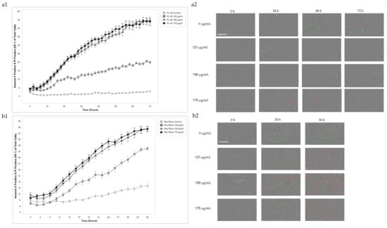 The IncuCyte live-cell analysis system used to study the effect of treatment with A. europaea extract on cell death in PL45 and Mia PaCa-2 cell lines. (a1) Real-time plots for cell death measurements in PL45 cells exposed to 125, 150, and 175 µg/mL of A. europaea extract for 72 h. (a2,b2) Representative images at X20 objective, of IncuCyte quantification in PL45 (a2) and Mia PaCa-2 (b2) cells. Scale bar 200 µm. In red, cells labeled with PI; in green, cells labeled with Annexin V. (b1) Real-time plots for cell death measurements in Mia PaCa-2 cells exposed to 125, 150, and 175 µg/mL of A. europaea extract for 36 h. Data are presented as mean ± SE of three independent experiments.