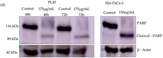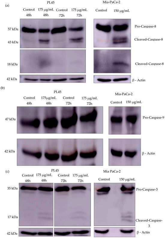 Western blot analysis of the caspases and PARP. PL45 and Mia PaCa-2 cells were treated with A. europaea extract. Mia PaCa-2 cells were treated with 150 µg/mL of A. europaea extract for 36 h, while PL45 cells were treated with 175 µg/mL for 48 and 72 h. The level of caspase-8 (a), caspase-9 (b), caspase-3 (c), and PARP (d) was analyzed by Western blotting, where β-actin was used as the loading control.