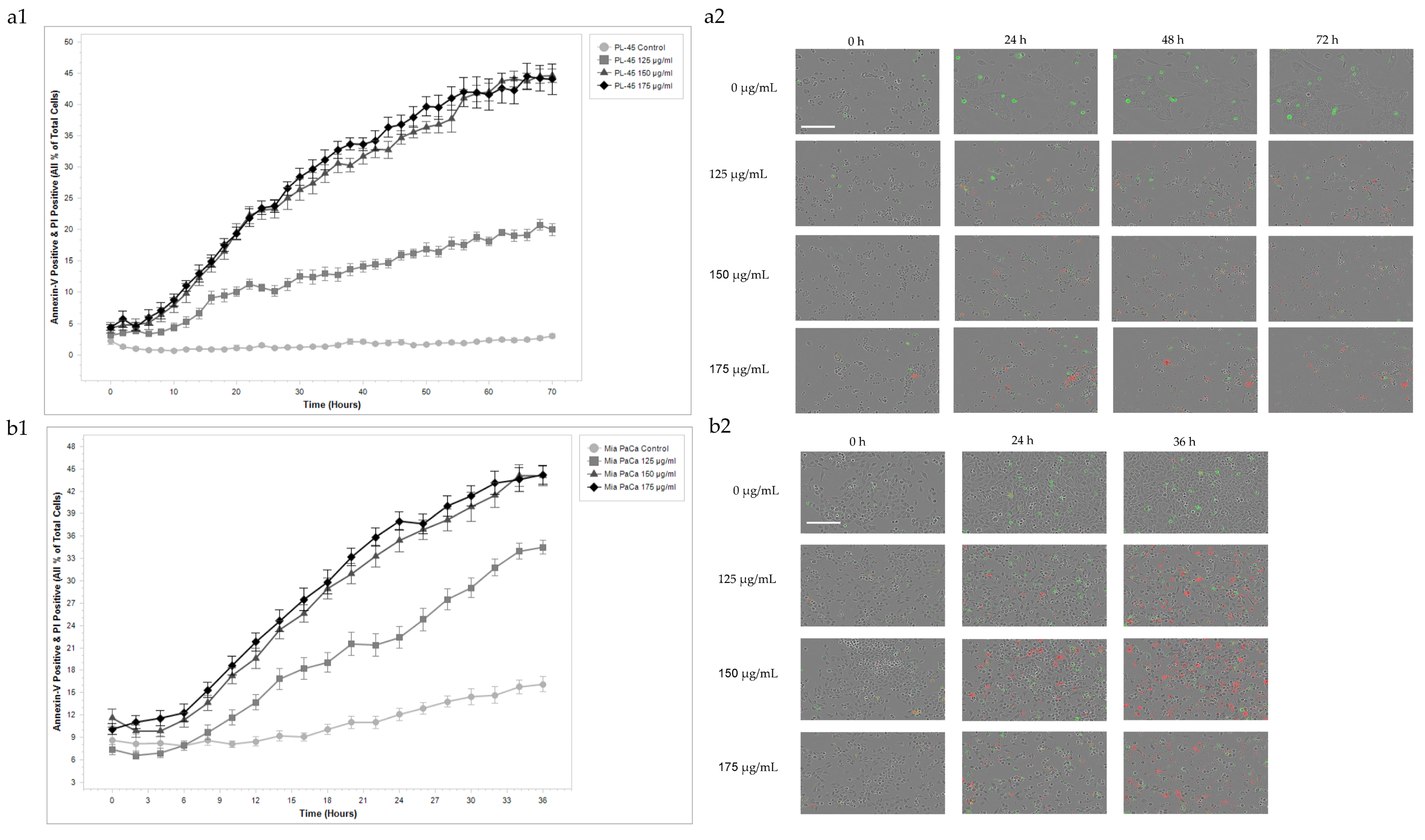 A. europaea extract on PL 45 and Mia PaCa-2 pancreatic cancer cell lines was assessed in real time using the IncuCyte SX5 Live-Cell Analysis System (Sartorius, Bohemia, NY, USA) with Annexin V labeling, as previously described [