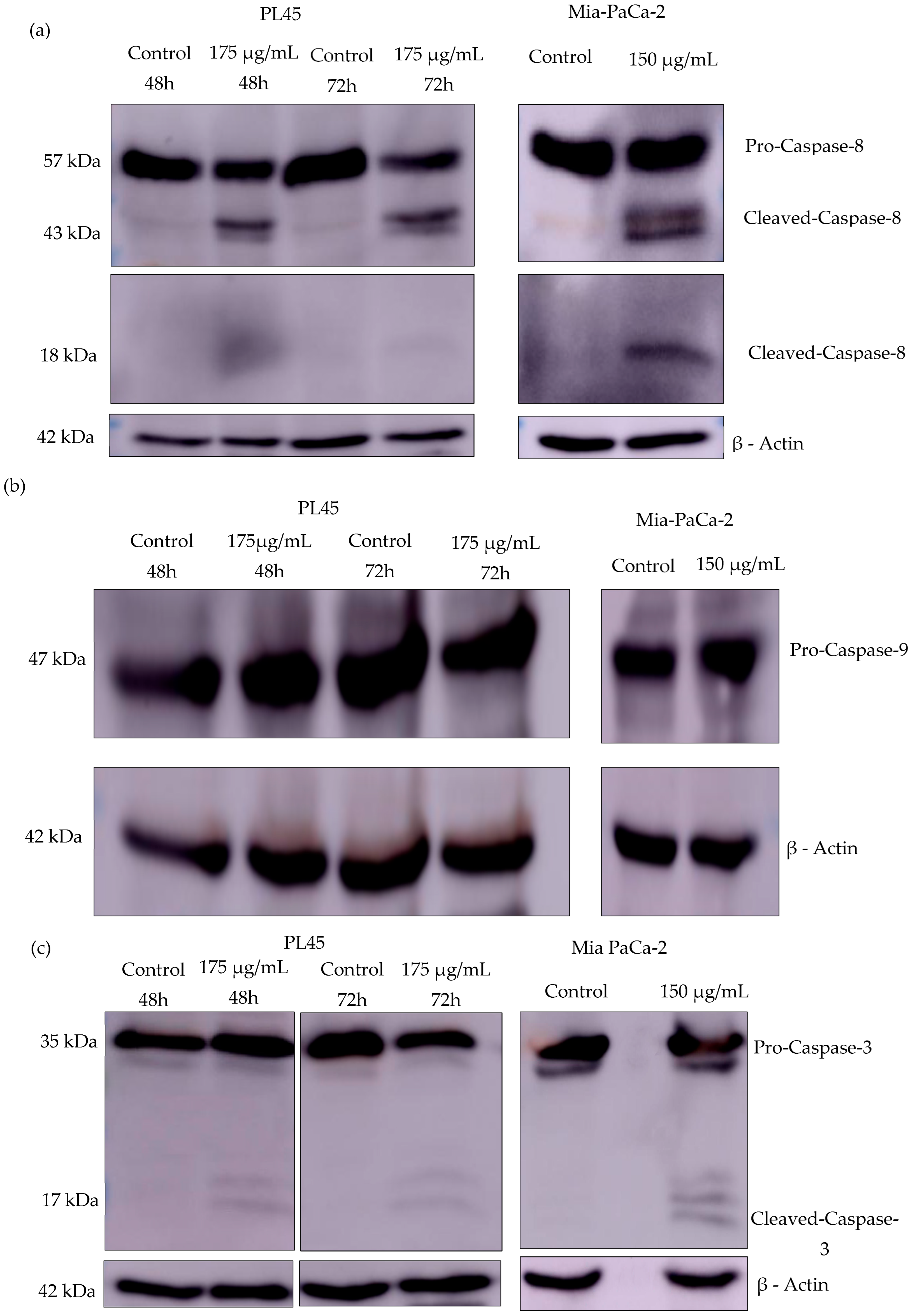 Western blot analysis was conducted for assessments of Caspase-8, -9, and -3 and PARP levels following treatment of PL45 cells (6 × 10