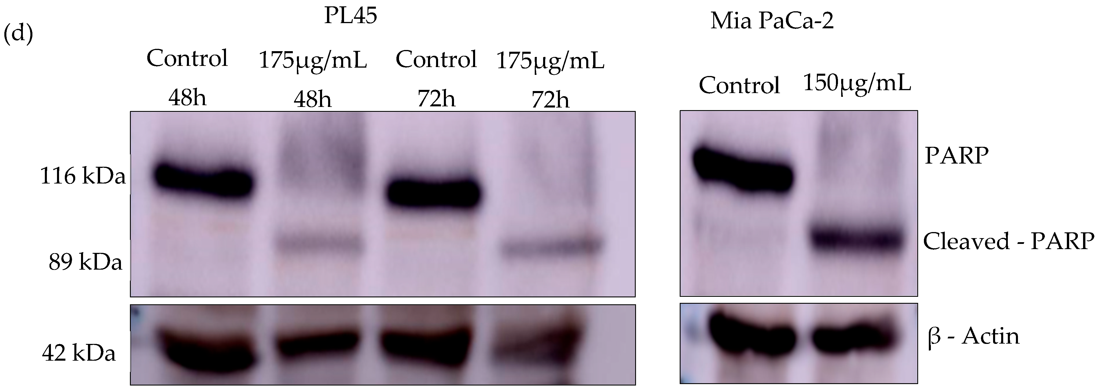 29] described the activation of caspase-3 and cleavage of PARP in colon and prostate cancer cells following exposure to methanolic extract from the aerial parts of