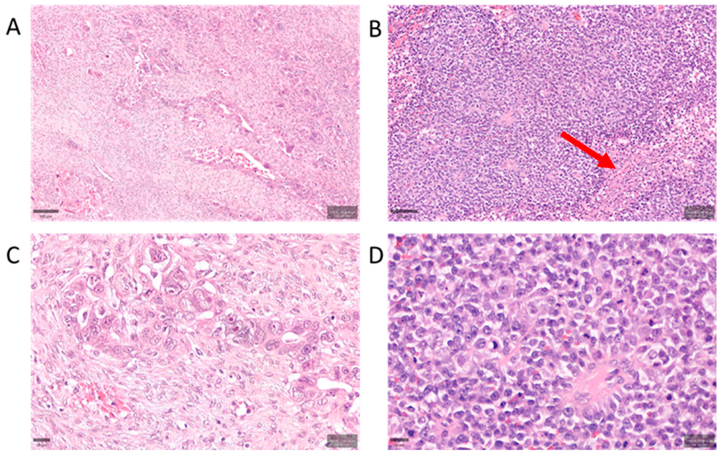 Figure 1. Histopathologic differences between classic and SET-pattern HGSC. Representative hematoxylin and eosin (H&E) stained sections illustrating tumor morphology and microenvironment in classic HGSC (A,C) vs. SET-variant HGSC (B,D). (A) Classic HGSC at low magnification (scale bar 100 μm) shows papillary and glandular architectures with noticeable fibroblastic stromal cores, moderate tumor cell atypia, and relatively sparse lymphocytic infiltrates. (B) SET-pattern HGSC at low magnification (scale bar 100 μm) is characterized by solid sheets and nests of high-grade tumor cells with geographic necrosis. The SET tumor displays brisk TILs (examples highlighted by red arrowhead) scattered throughout a markedly scant stroma. (C) High-power view of classic HGSC (scale bar 20 μm) highlighting tumor cells separated by desmoplastic stroma and a paucity of TILs. (D) High-power view of SET-pattern HGSC (scale bar 20 μm) illustrating densely packed tumor cells and abundant TILs within minimal intervening stroma. Classic tumors generally have a stroma-rich (desmoplastic) appearance, whereas SET tumors have a “solid” growth with frequent TILs and much less stromal content.